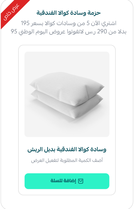 📍 مثال: عرض (حزمة وسادة كوالا الفندقية) يقدّم 5 وسادات بسعر ثابت 195 ريال بدلاً من 290 ريال، ليشجّع العميل على شراء الكمية الكاملة بسعر مغرٍ وواضح.
