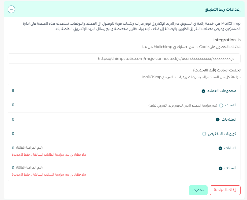 ستتم المزامنة تلقائياً، وإن رغبت بإعادة المزامنة لكل من العملاء والمجموعات وبقية العناصر مع Mailchimp اضغط على (مزامنة).
