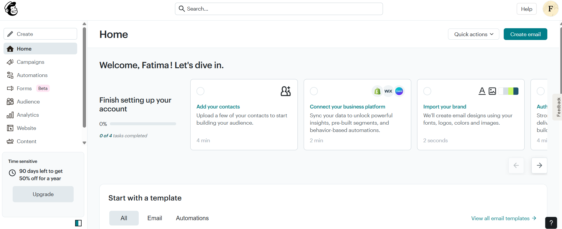 ستظهر الصفحة الرئيسية لحسابك على Mailchimp بالشكل: