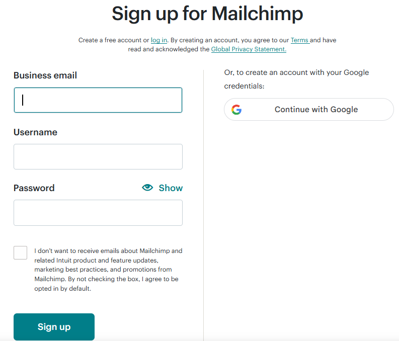 1. انتقل إلى صفحة تسجيل حساب جديد على Mailchimp، وأدخل البيانات المطلوبة لإنشاء حساب جديد على Mailchimp، والتي تتضمن: البريد الإلكتروني، واسم المستخدم، وكلمة المرور. ثم اضغط تسجيل (Sign Up).