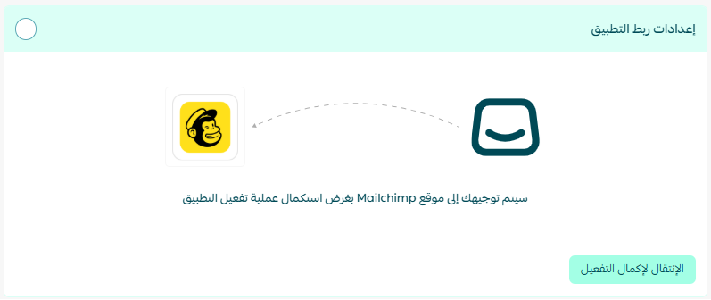 4. لإكمال الربط من تفاصيل تطبيق Mailchimp اضغط (الانتقال لإكمال التفعيل).