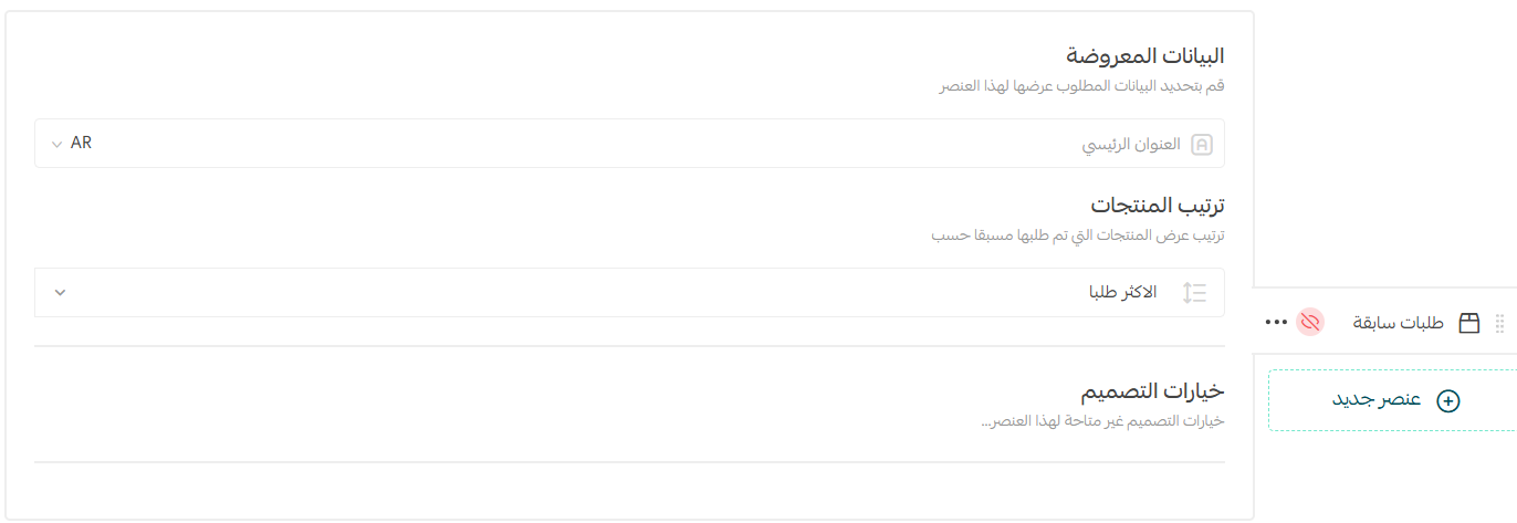 لتخصيص تصميم العنصر أدخل عنوان الرئيسي، وحدد من القائمة ما تريد عرضه أهو المنتجات الأكثر طلباً أم آخر الطلبات.