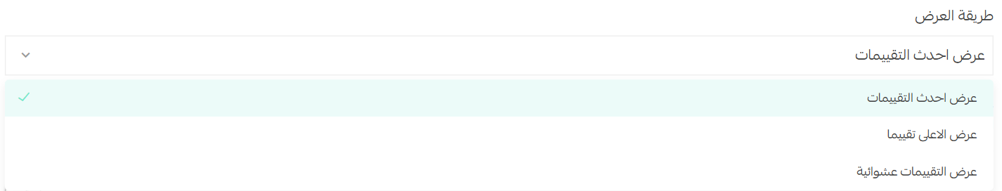 يمكنك اختيار طريقة عرض التقييمات من خلال قائمة (طريقة العرض). وهي عرض التقييمات الأحدث, أو الاعلى أو بشكل عشوائي.