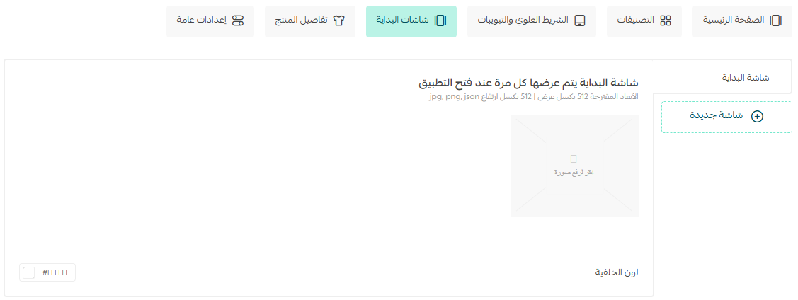 3. من قسم (شاشة البداية) ارفع صورة متحركة تختارها لتطبيقك بصيغة png, jpgjson, وبمقاس مُفضل هو (512*512).