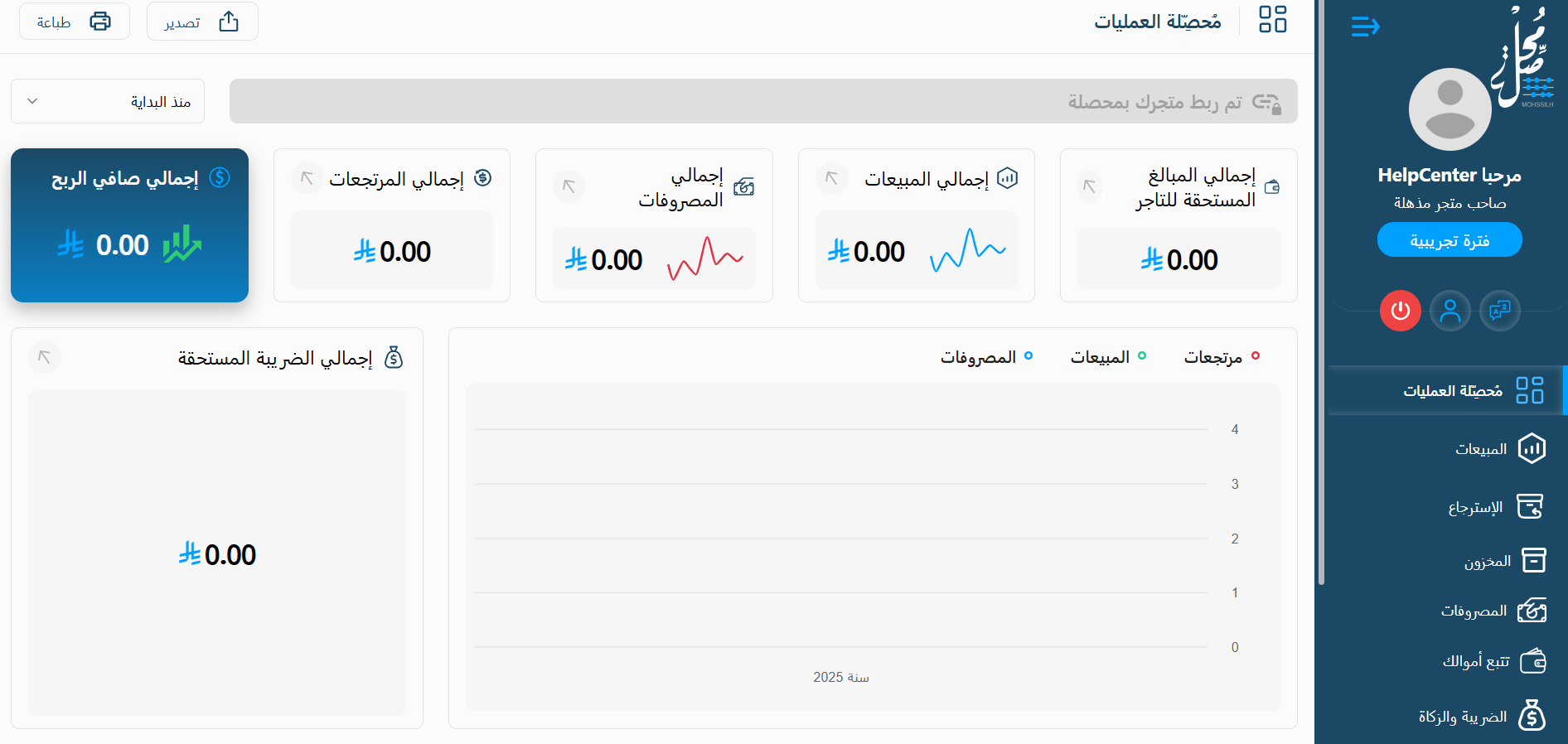 2. بمجرد تسجيل الدخول، سيتم توجيهك تلقائياً إلى الصفحة الرئيسية لمنصة محصلة، حيث يمكنك استعراض نظرة عامة على أداء متجرك المالي.