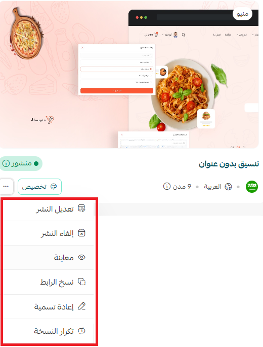 📝 ملاحظة: تختلف خيارات (المزيد) حسب حالة الثيم؛ فإذا كان الثيم مجدولاً أو غير منشور، ستظهر خيارات إضافية مثل نشر الثيم أو إعادة الجدولة.