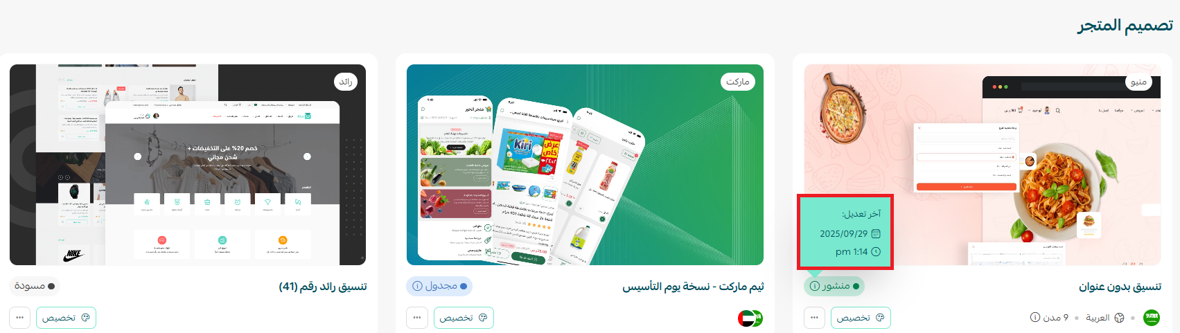 في حال إنشاء أكثر من نسخة للثيم، ستظهر جميع النسخ في صفحة إدارة الثيمات. أسفل كل ثيم يتم توضيح حالته، سواء كان منشوراً أو مجدولاً، مع عرض تاريخ النشر، وفي حال كان الثيم منشوراً سيظهر أيضاً تاريخ آخر تعديل.