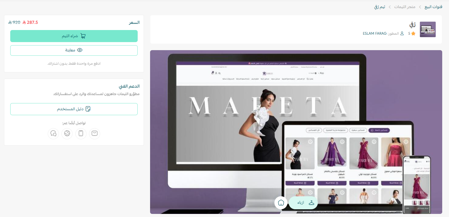 عند الضغط على الثيم المطلوب سيظهر بكافة تفاصيله مع إظهار خيار التواصل مع الدعم الفني.