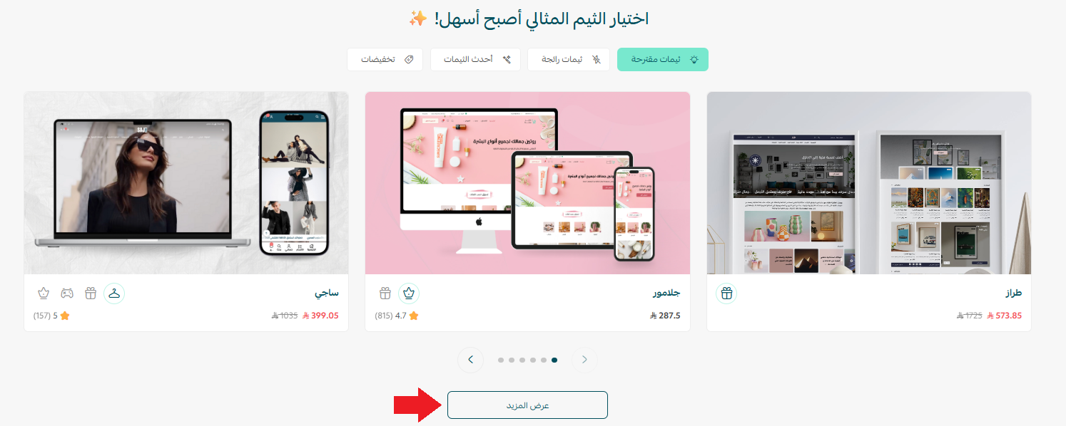 من صفحة متجر الثيمات، يمكنك تصفح المزيد من الثيمات في أي قسم بضغط (عرض المزيد).