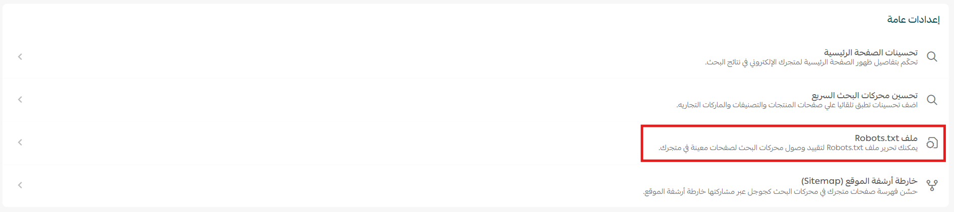 1. من صفحة تحسين محركات البحث، من الإعدادات العامة اضغط (ملف Robots.txt).