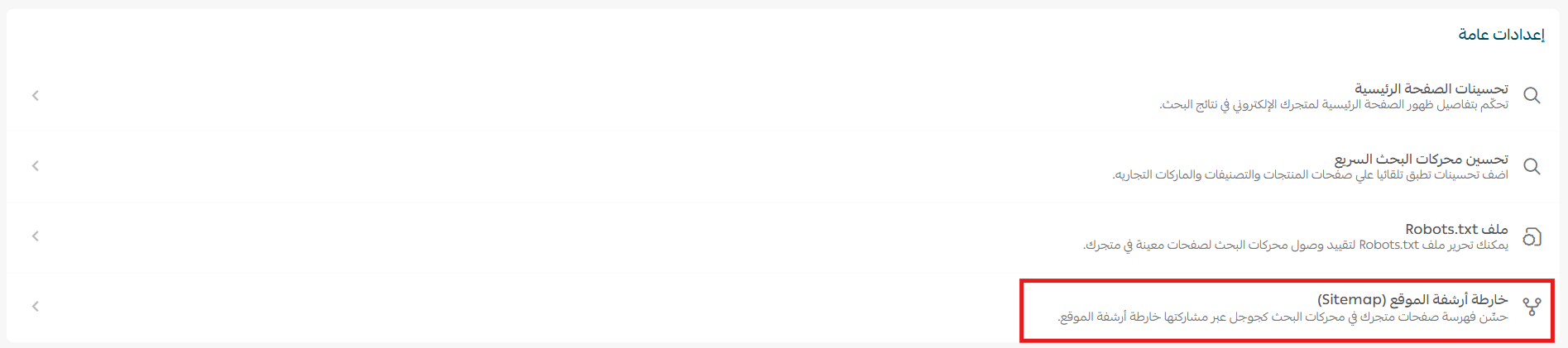 1. بعد فتح صفحة تحسين محركات البحث، من الإعدادات العامة اضغط (خارطة أرشفة الموقع Sitemap) لتحسين فهرسة صفحات المتجر في محرك البحث.