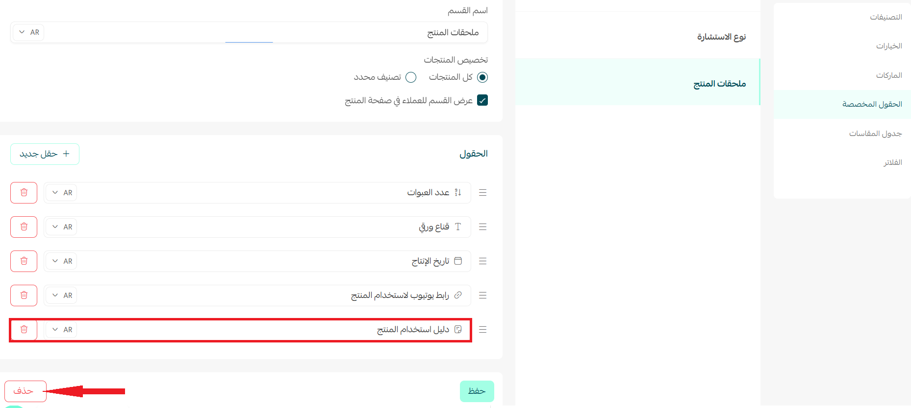 من خلال عرض تفاصيل الحقل المخصص، اضغط (حذف) لحذف الحقل بكامله أو حذف أحد قيمه كما في الشكل: