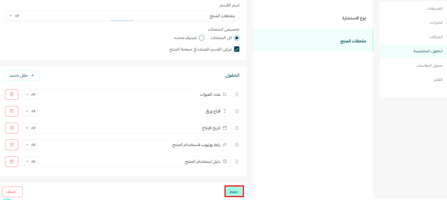 - صفحة الحقول المخصصة