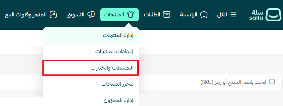 2. من صفحة قائمة المنتجات، اختر (التصنيفات والخيارات).