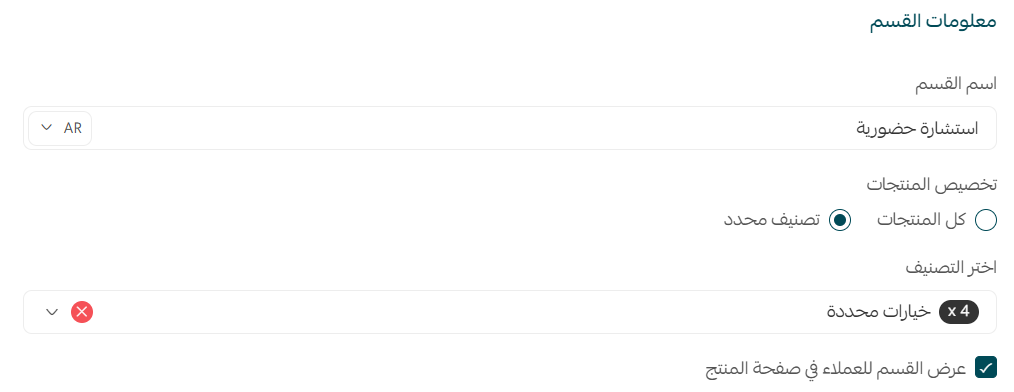 - حدد إن كنت ترغب بإظهار القسم للعملاء في صفحة المنتج ضمن المتجر.
