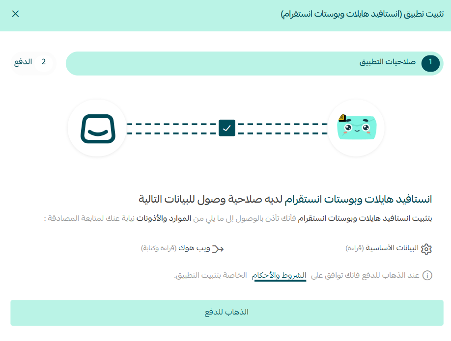 5. تحقق من الأذونات المطلوبة، ثم اضغط (الذهاب للدفع).