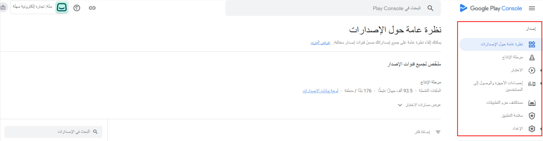 الأقسام الرئيسية في لوحة تحكم Google Play Console: