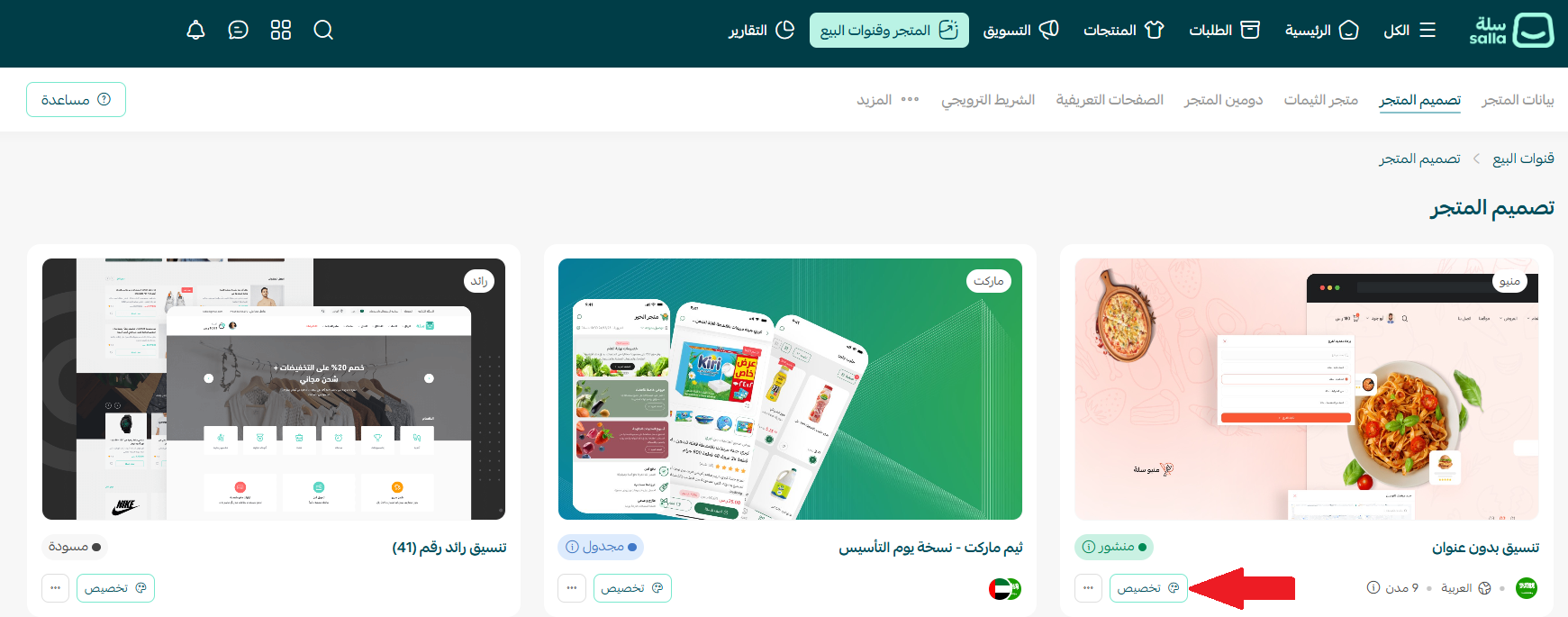 1. من القائمة الرئيسية اضغط (المتجر وقنوات البيع)، ثم اضغط (تصميم المتجر).