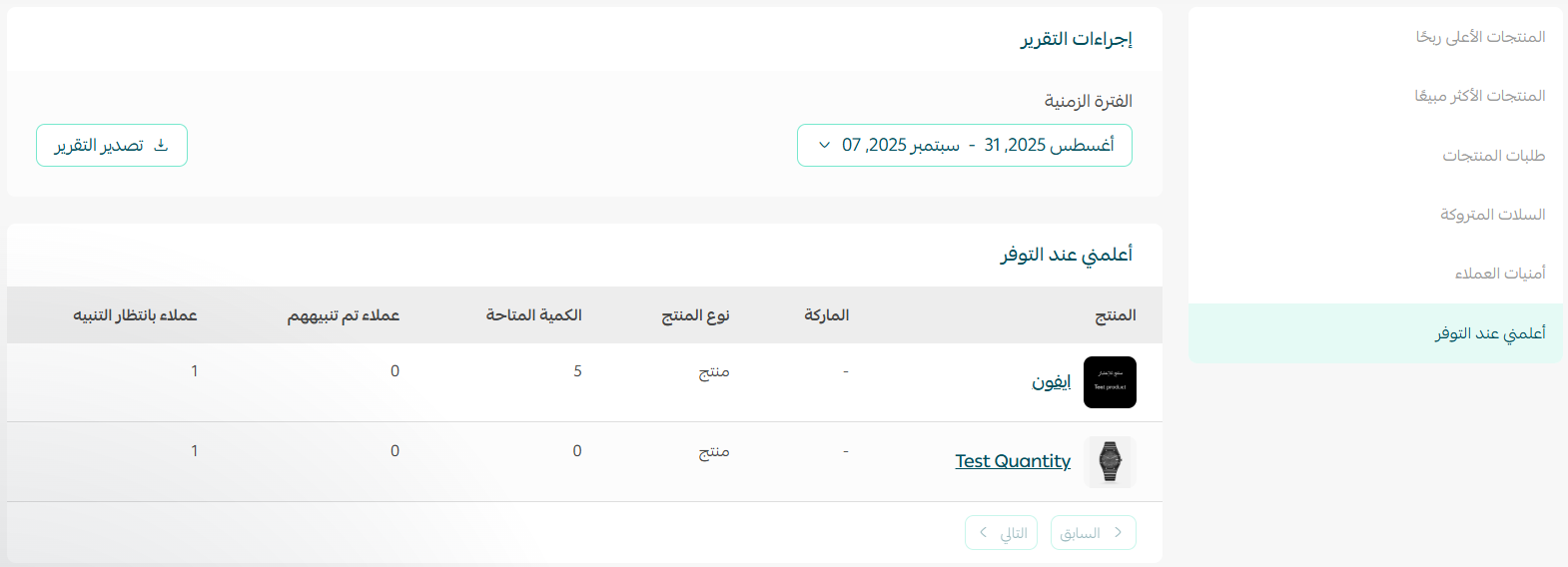 لاستعراض التقرير ضمن مدة زمنية معينة, حدد تاريخ (اعلمني عند التوفر) وتنقل بين الصفحات بسهولة.