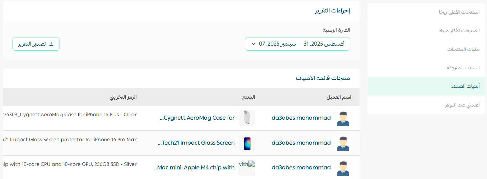 لاستعراض التقرير ضمن مدة زمنية معينة, حدد تاريخ (امنيات العملاء) وتنقل بين الصفحات بسهولة.