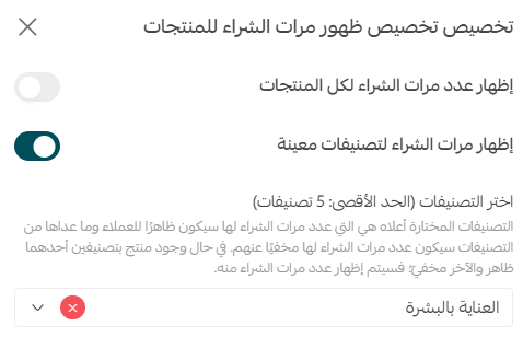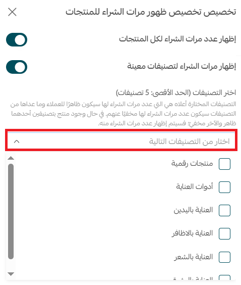 عند تفعيل خيار (إظهار مرات الشراء لتصنيفات معينة)، ستتمكن من تحديد حتى 5 تصنيفات كحد أقصى.