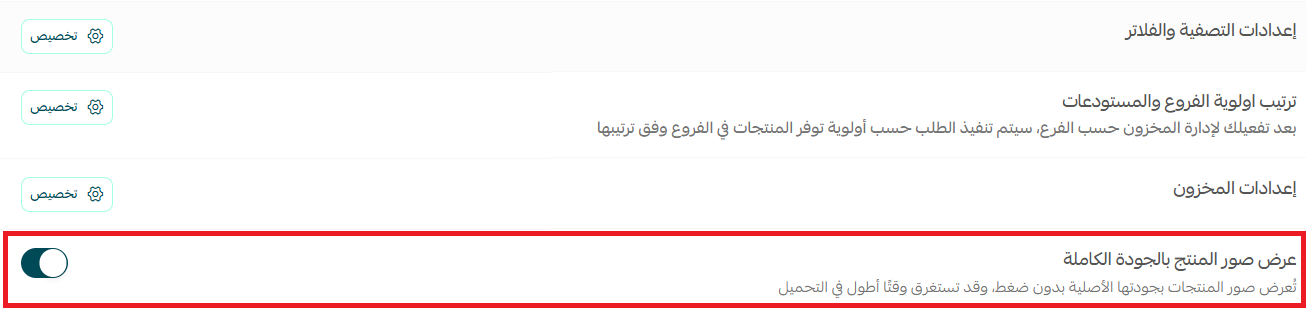 عند التفعيل: تُعرض الصور بجودتها الكاملة في صفحة المنتج وفي صفحات التصنيفات، ويشمل ذلك الصورة الأساسية للمنتج في صفحة المنتج.