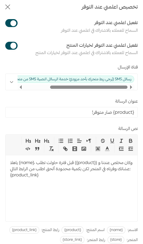 2- تفعيل التنبيه عند توفر خيارات المنتج.
