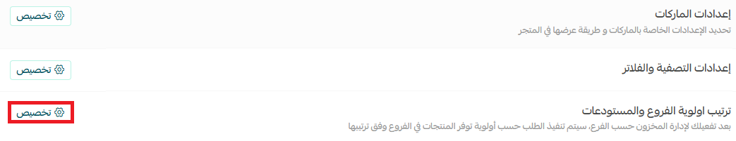 يمكنك تحديد أولوية الفروع أو المستودعات في تنفيذ الطلبات حسب توفر المنتج، وذلك من خلال الضغط على زر (تخصيص).