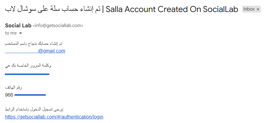 بعد إتمام التثبيت في متجرك, ستصلك رسالة عبر بريدك الإلكتروني تحمل بيانات تسجيل الدخول.