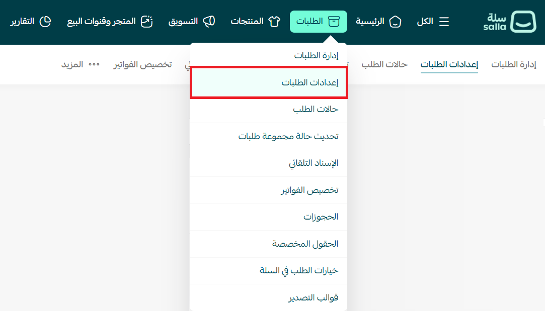 صفحة إعدادات الطلبات