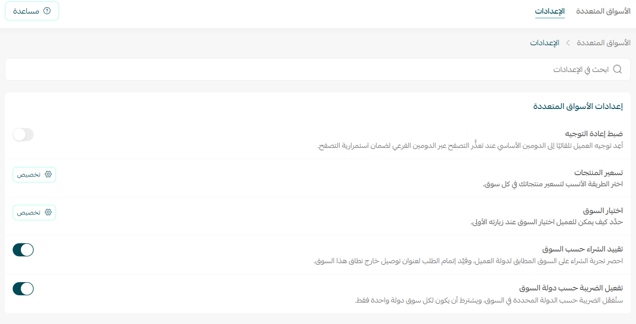 توفر ميزة الأسواق المتعددة إمكانية تخصيص تجربة المتجر حسب السوق المستهدف. يمكنك من خلالها ضبط إعادة التوجيه، وتخصيص الأسعار، وتحديد طريقة اختيار السوق.