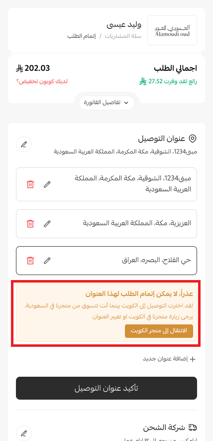 متجر يوفّر التوصيل داخل السعودية فقط لاعتبارات لوجستية. عند تفعيل هذا الخيار، لا يتمكن العميل من إتمام الطلب إذا كان عنوان التوصيل خارج السعودية، مما يمنع الطلبات الخاطئة ويقلل الإلغاءات.