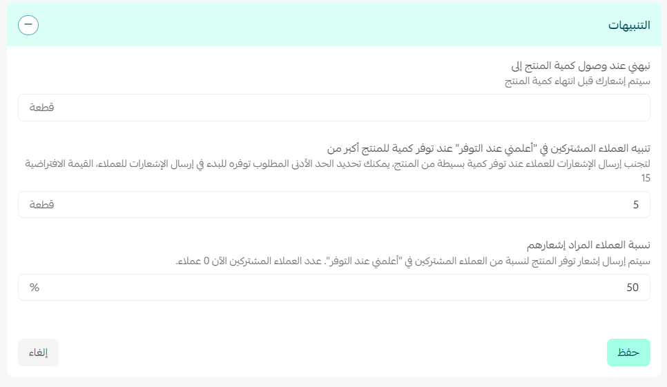 تحديد الحد الأدنى للكمية المتوفرة: يمكنك اختيار عدد القطع الذي يجب توفره قبل أن يبدأ النظام بإرسال التنبيهات للعملاء.
