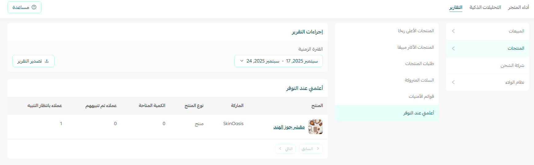 يمكنك تحديد المنتجات التي تحتاج التركيز على توفيرها بناء على الكمية المتوفرة، وكذلك العملاء الذين ينتظرون التنبيه، والذين تم تنبيههم.