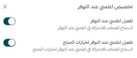 🔹 تفعيل أعلمني عند التوفر: يعني أنك كصاحب متجر تفعل الميزة على مستوى المنتج بالكامل.