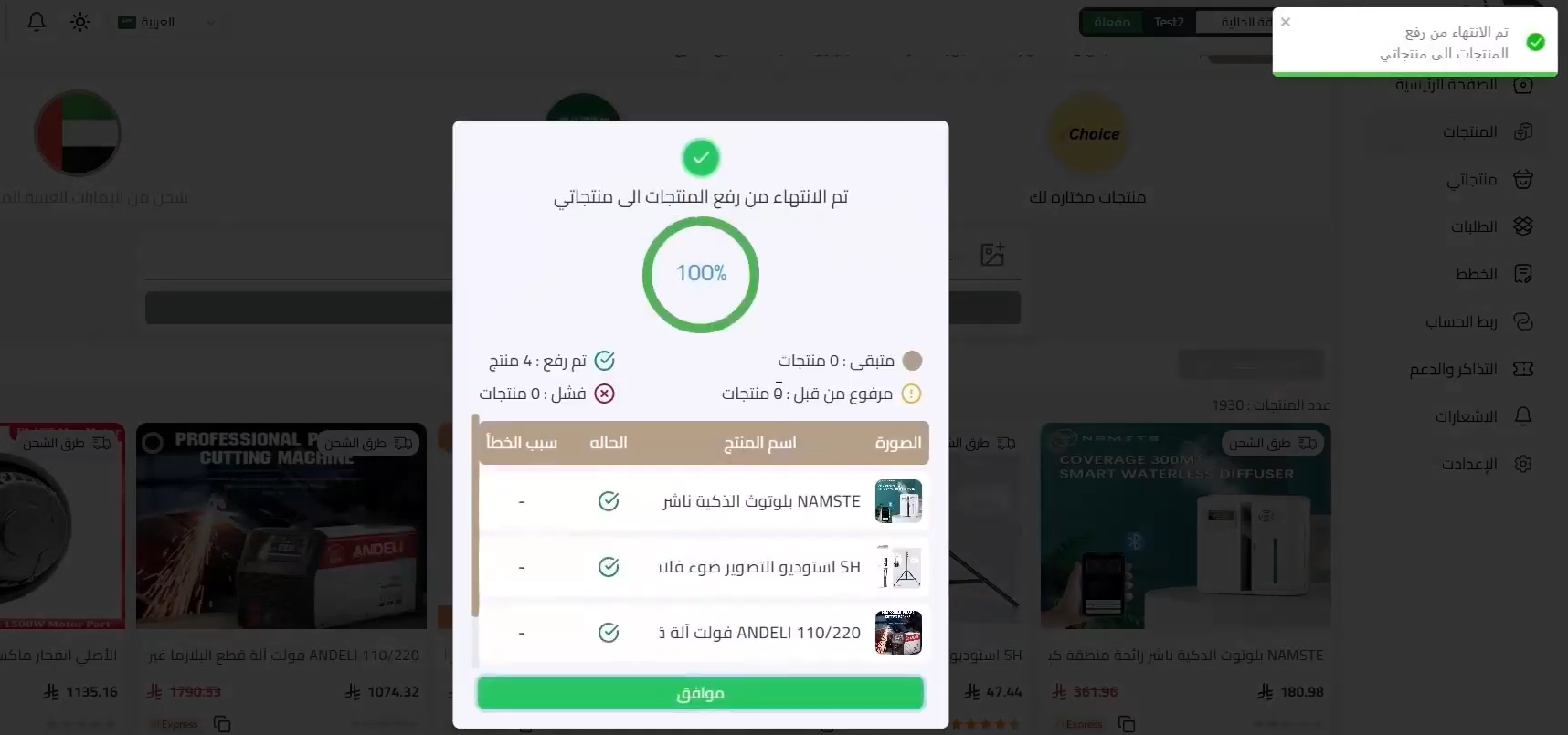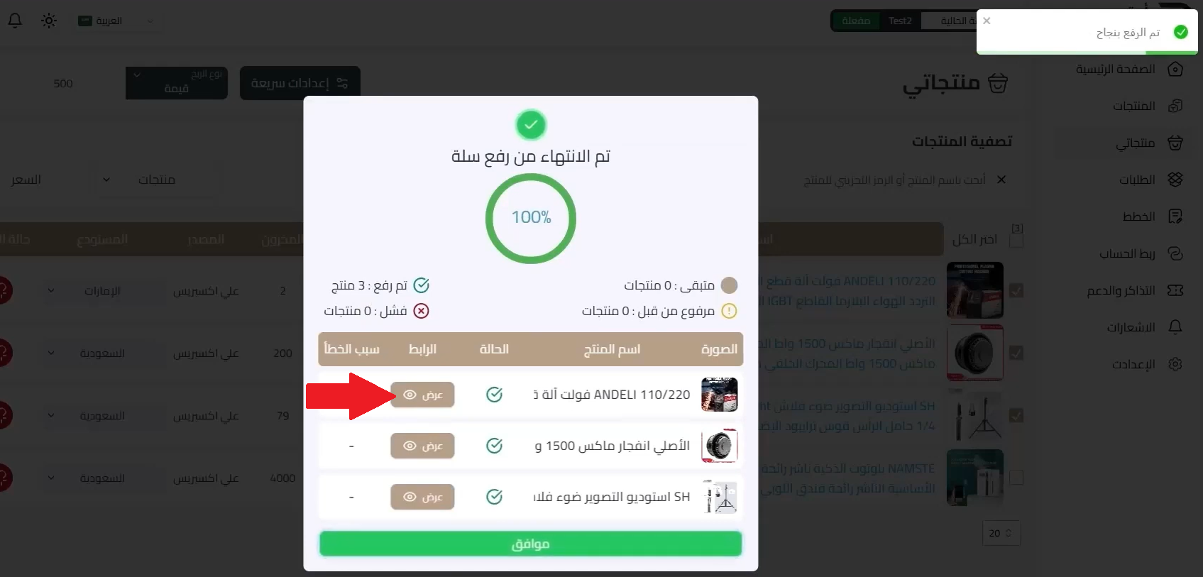 7. بعد انتهاء تحميل المنتجات، سيتم إضافتها بنجاح الى قائمة منتجاتي.