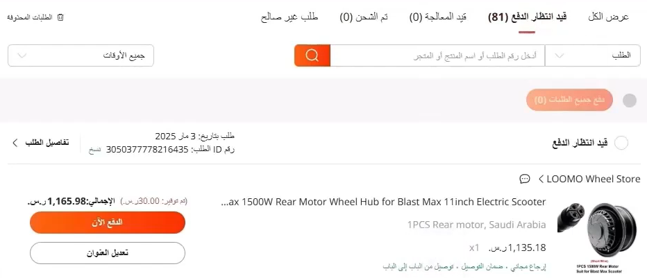 4. انتقل إلى حسابك في علي اكسبريس،من قسم (الطلبيات الخاصة بي) سيظهر لك الطلب ويمكنك اتمام الدفع.