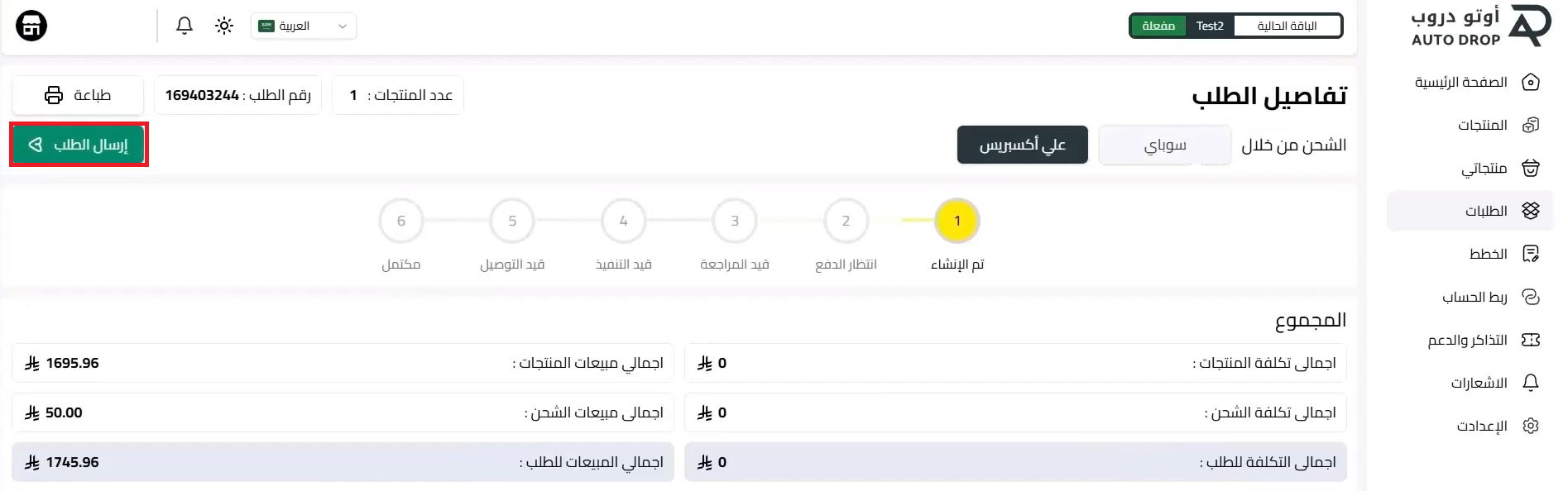 3. بعد الضغط على رقم الطلب ستظهر لك التفاصيل، اضغط على (ارسال الطلب).