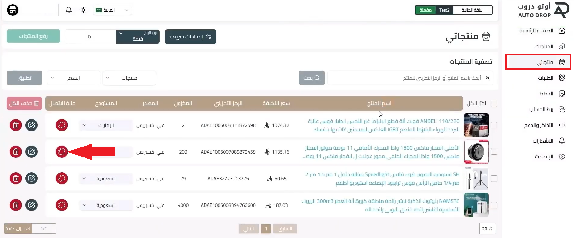 وستظهر لك المنتجات المضافة، ولكن حالتها غير متصل (أي لم تُرفع بعد إلى متجرك).