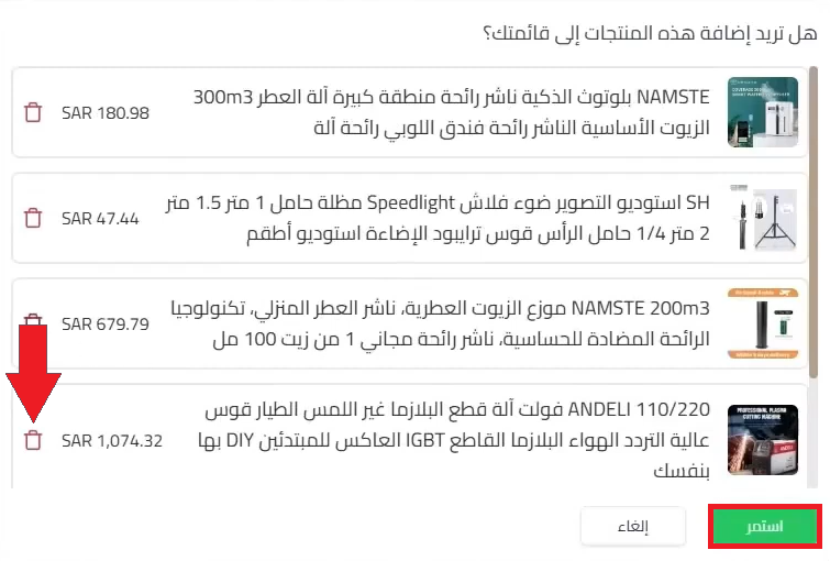6. راجع المنتجات في النافذة المنبثقة، ويمكنك حذف أي منتج قبل المتابعة.