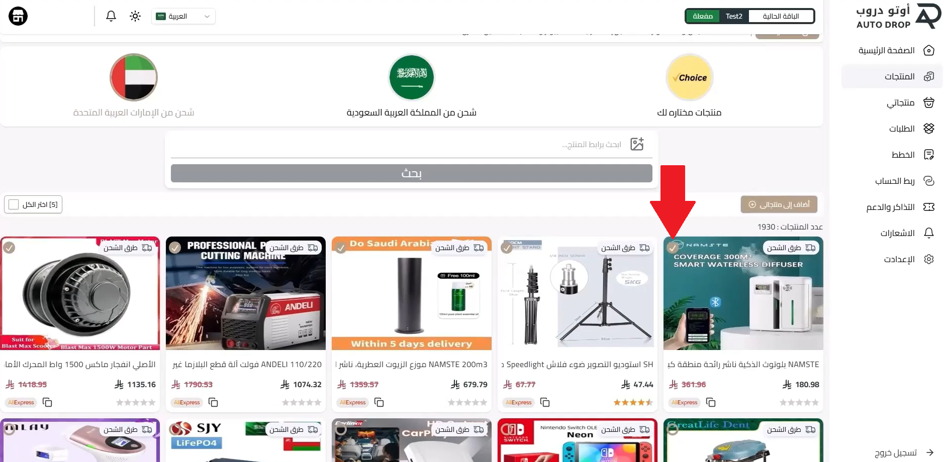 ولإضافة المنتج حدد المنتج عن طريق اختيار علامة صح اعلى يسار المنتج.
