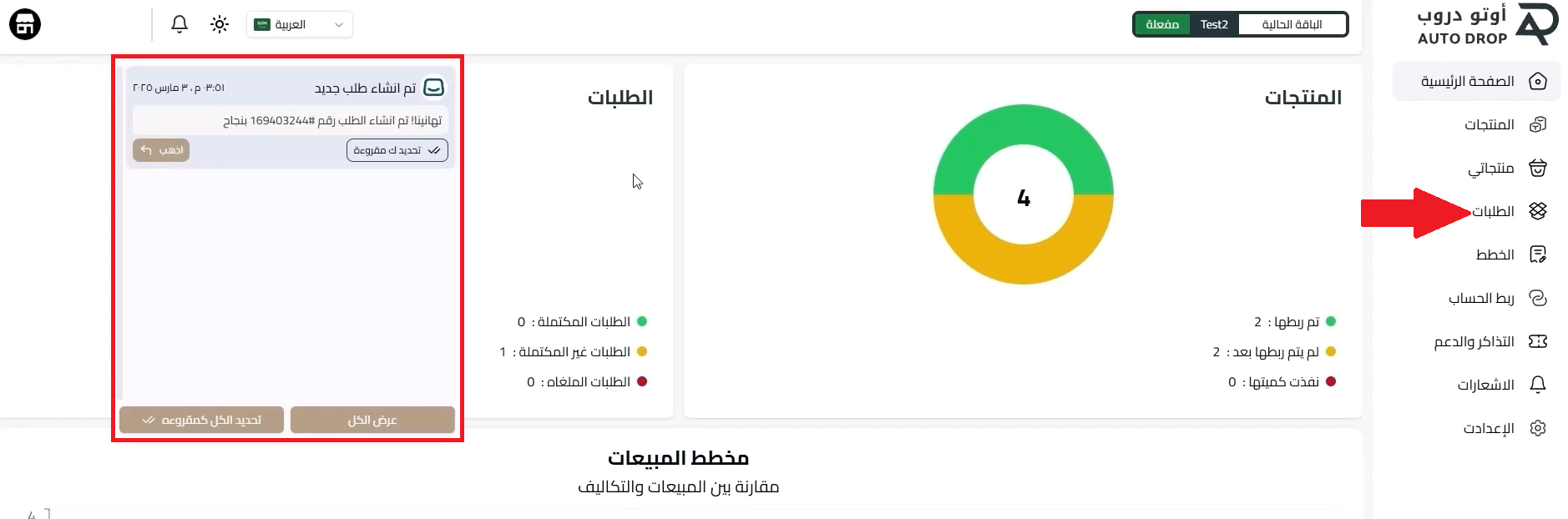 1. سيظهر لك الطلب في أيقونة الاشعارات، أو من القائمة الجانبية لتطبيق أوتو دروب، اضغط (الطلبات).
