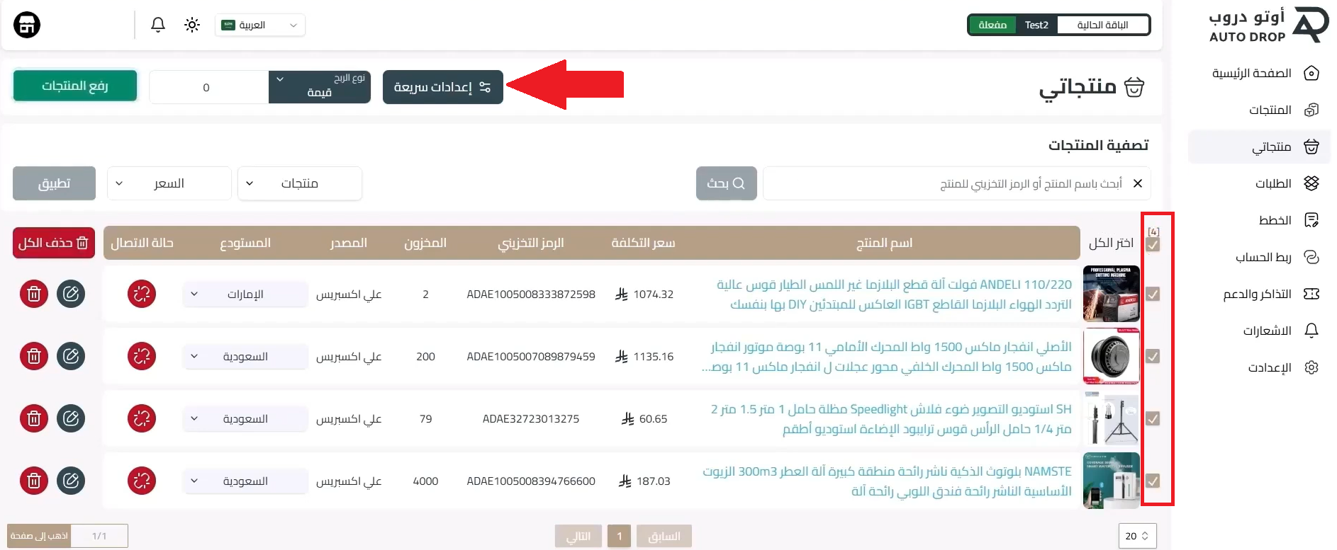 2. لرفع منتجاتك على سلة حدد المنتجات، ثم اضغط (إعدادات سريعة).