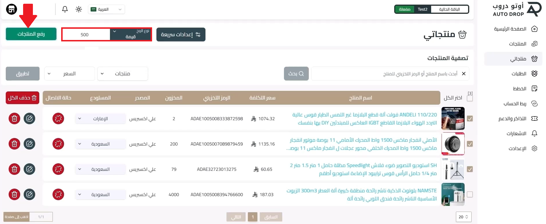 4. حدّد نوع الربح والمبلغ المرغوب، ثم اضغط (رفع المنتجات).