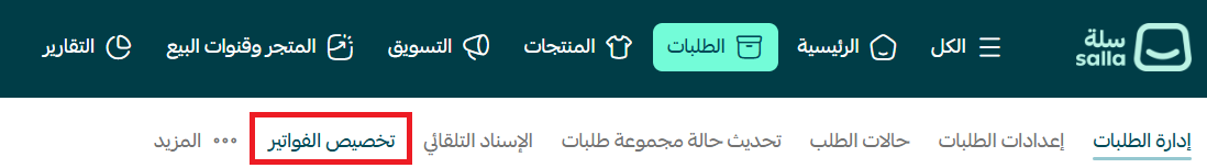 من القائمة الرئيسية، اضغط (الطلبات)، واضغط تبويب (تخصيص الفواتير).