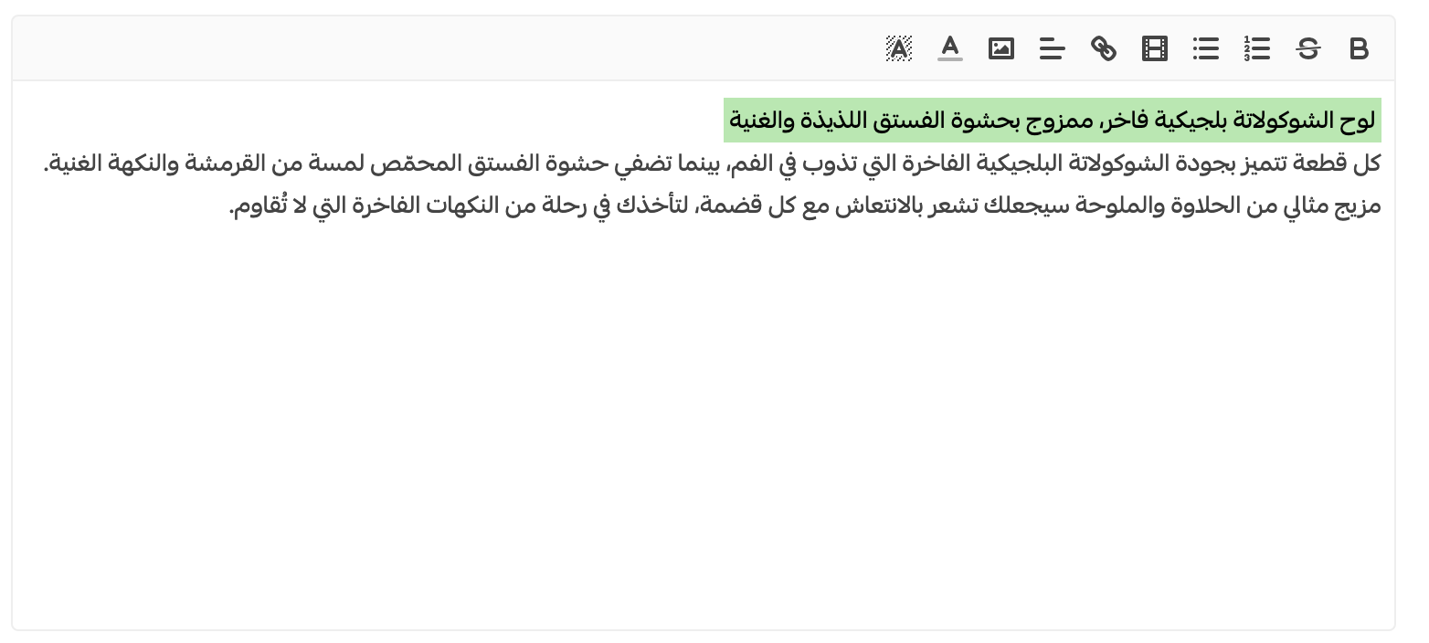 - اسم المنتج: أكتب اسم المنتج متضمناً أبرز المكونات (لوح شوكلاته بالحليب، تشيز كيك بالفراولة، بيتيفور بحشوة الفستق)
