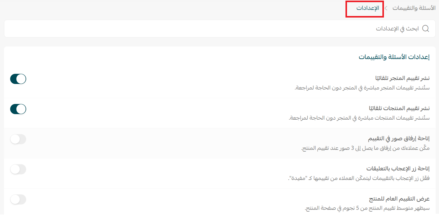 سيظهر ضمن صفحة الأسئلة والتقييمات قائمة بأقسام تصنيفات التقييمات مثل (تقييم المتجر، تقييم المنتجات، تقييم شركات الشحن، وغيرها).