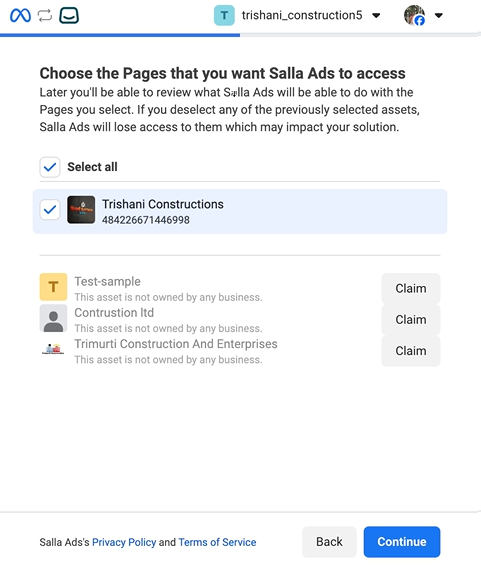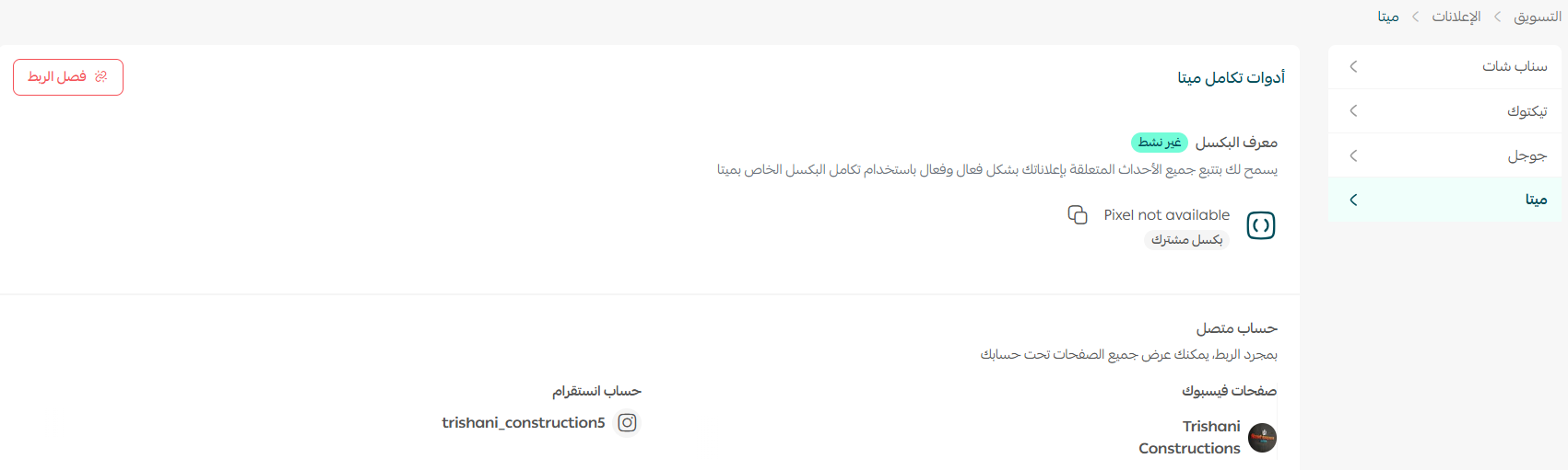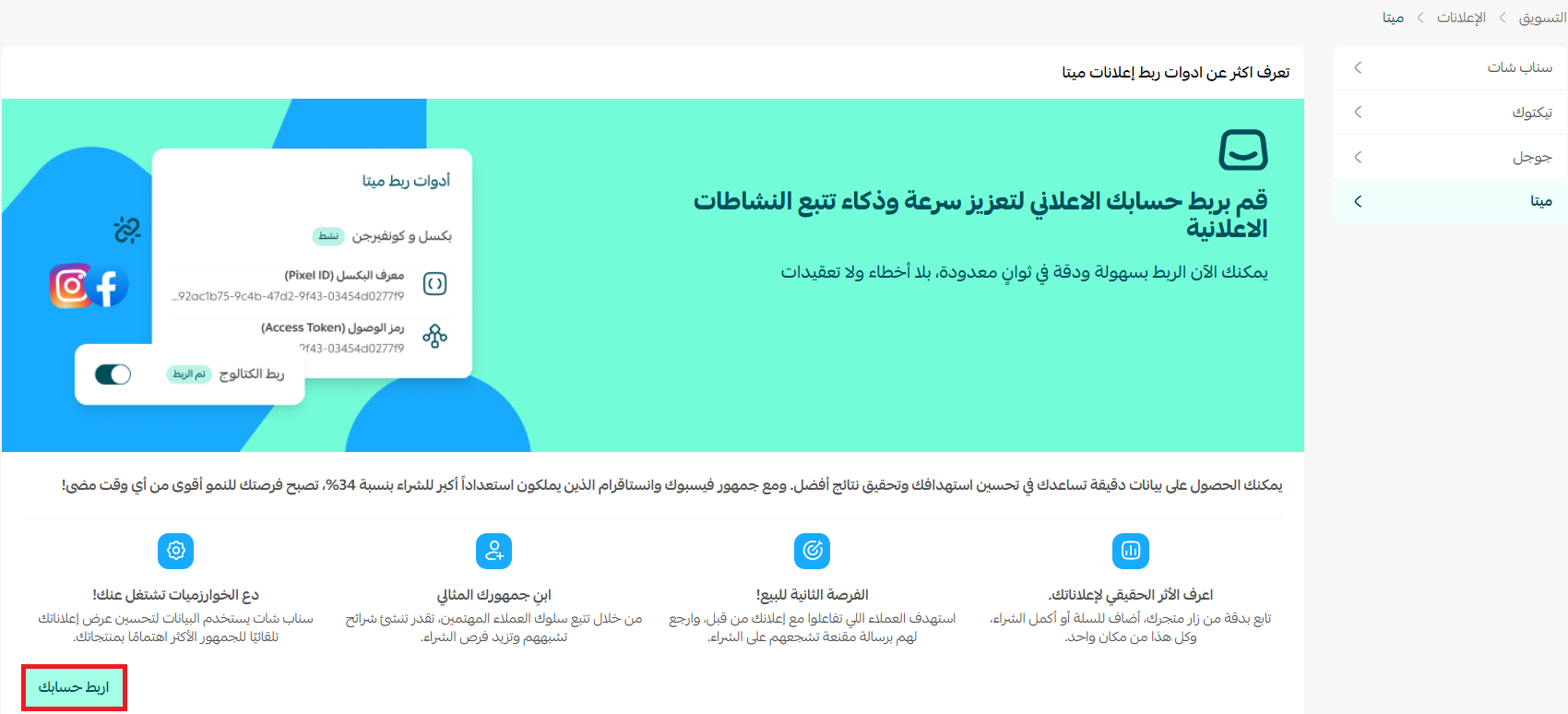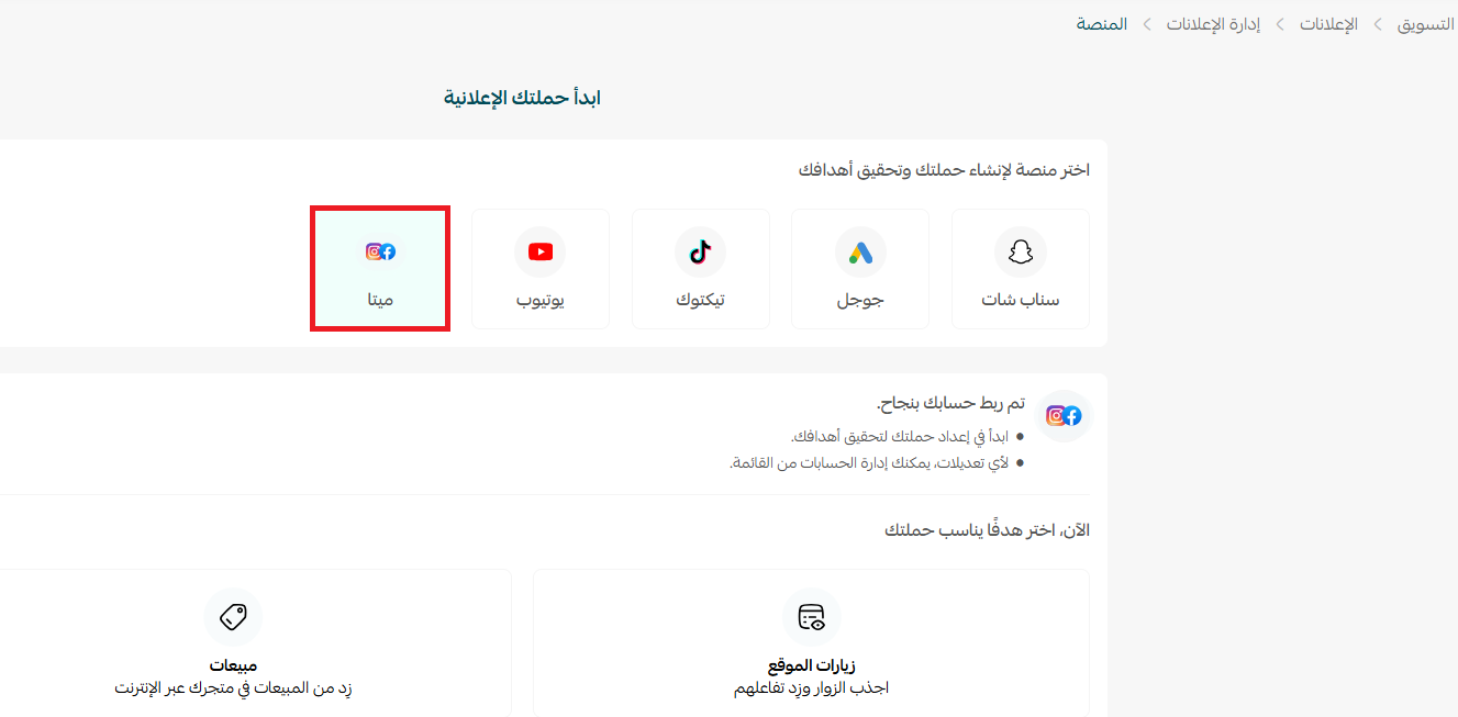 تهانينا على نجاح الربط مع حسابك الإعلاني على ميتا.
