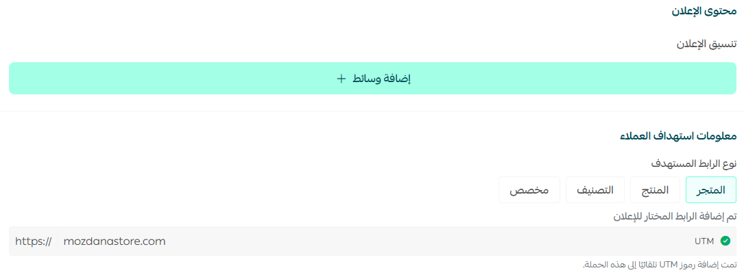 أضف صورة للإعلان من خلال إضافة وسائط، ثم حدد نوع الرابط المستهدف من الإعلان والذي سيُحول له العميل عند تفاعله مع الحملة.
