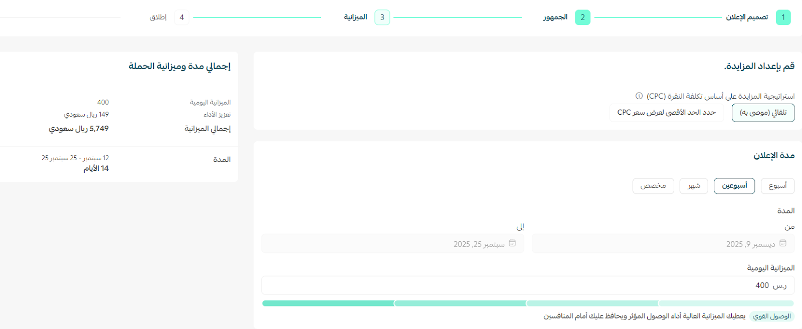 7. حدد ميزانية الحملة 💰بتحديد مدة الإعلان واستراتيجية المزايدة CPC.